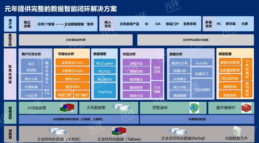 智能应用层是“元年C1智答”的核心部分,通过用户行为分析、可视化分析、数据提取、对话分析、数据分析和模型配置,涵盖了企业数据中台的大部分功能。